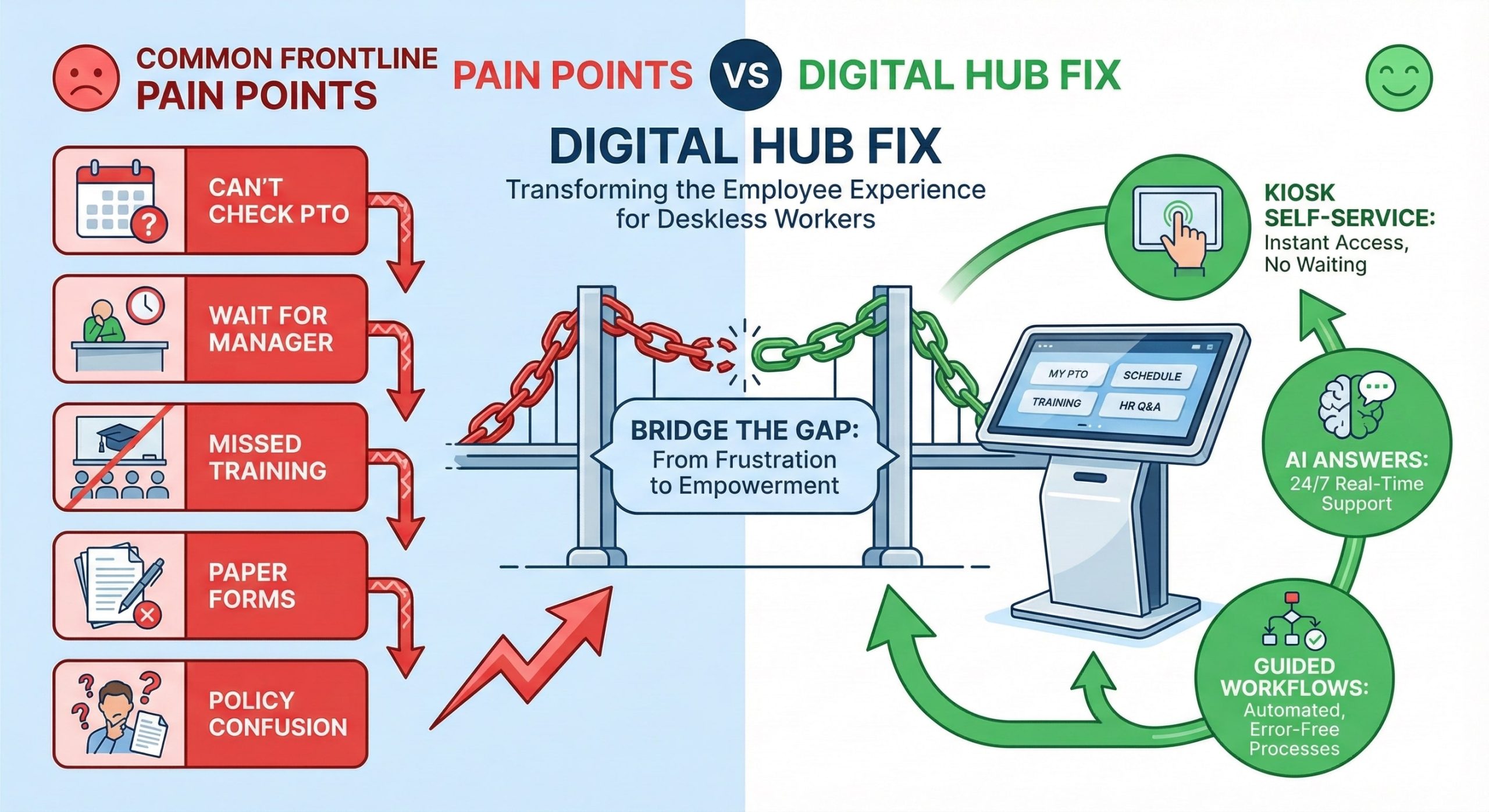 Frontline employees should not have to work harder to access basic HR services. A Digital Hub kiosk model makes HR available where work happens, improves consistency, and supports a more equitable employee experience.