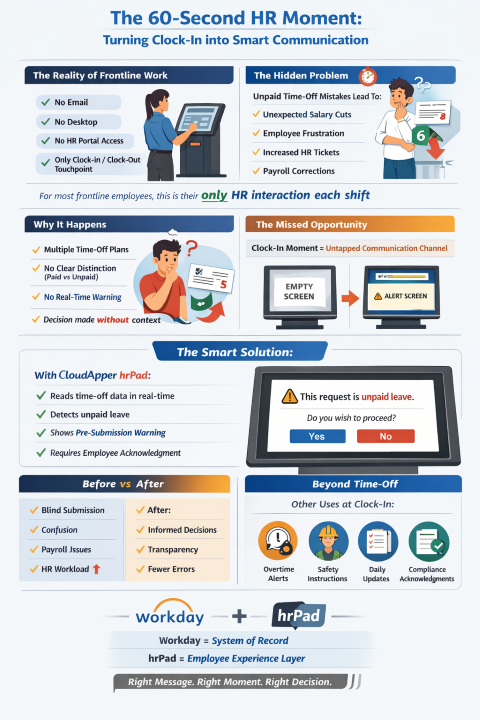 Frontline workers often interact with HR systems only at clock-in and clock-out, making those moments critical for communication. This blog explores how organizations can use smart kiosk solutions like CloudApper hrPad to deliver timely alerts—such as unpaid time-off warnings—before submission. The result is fewer payroll issues, better transparency, and a more informed workforce.