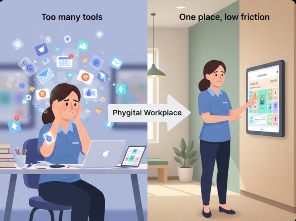 A phygital workplace blends physical spaces with digital support so employees can get what they need with less friction—without constantly switching apps or tools.